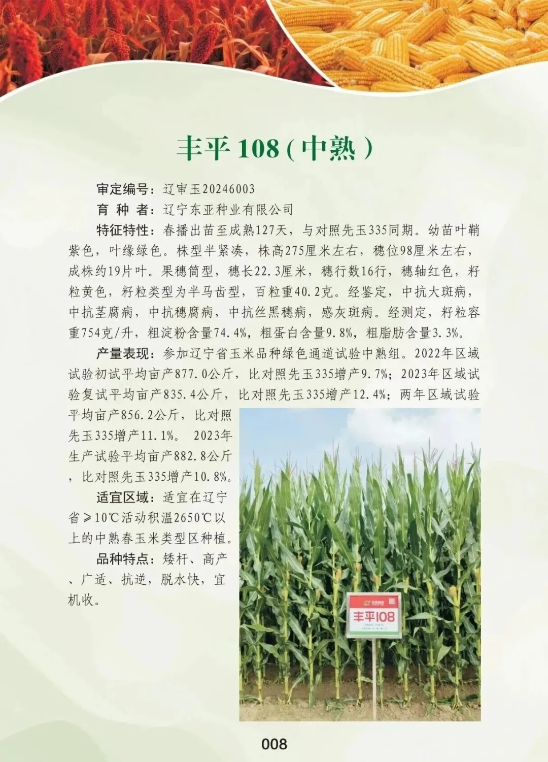豐平108是遼寧東亞種業(yè)有限公司自主研發(fā)的中熟玉米品種,適宜在遼寧省≥10℃活動(dòng)積溫2650℃以上的中熟春玉米類型區(qū)種植。